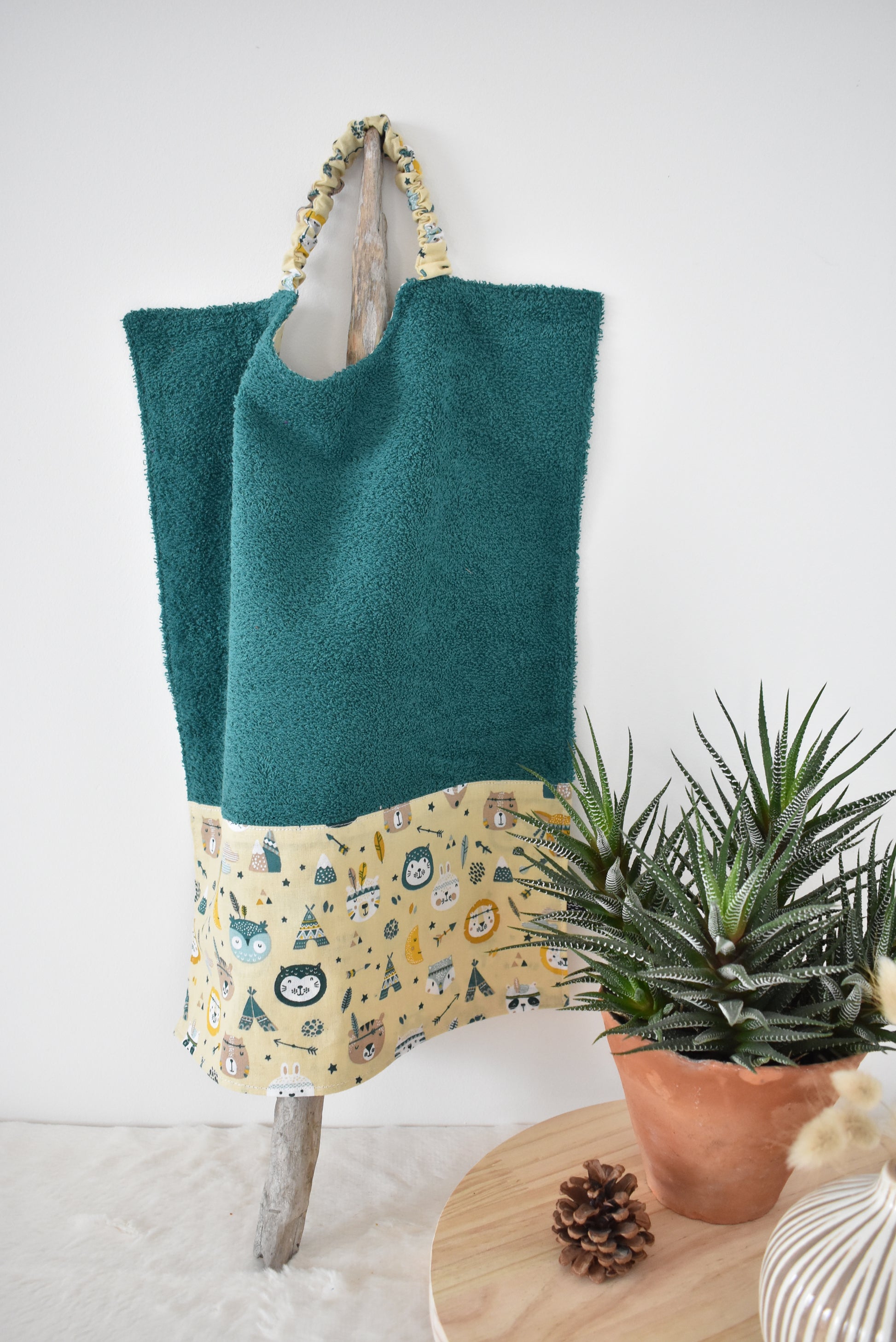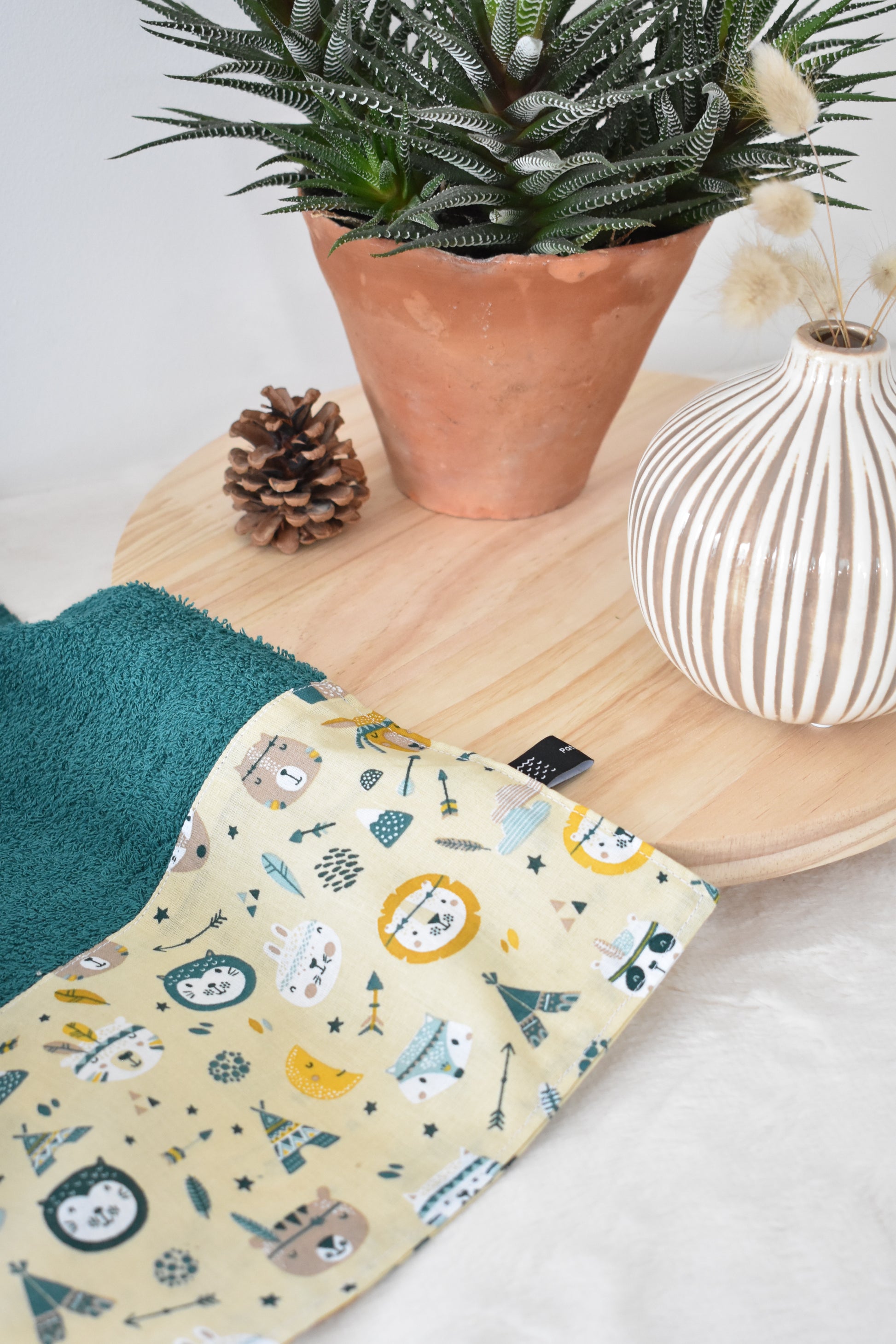 Devant : tissu éponge bambou vert et tissu coton imprimé animaux indiens