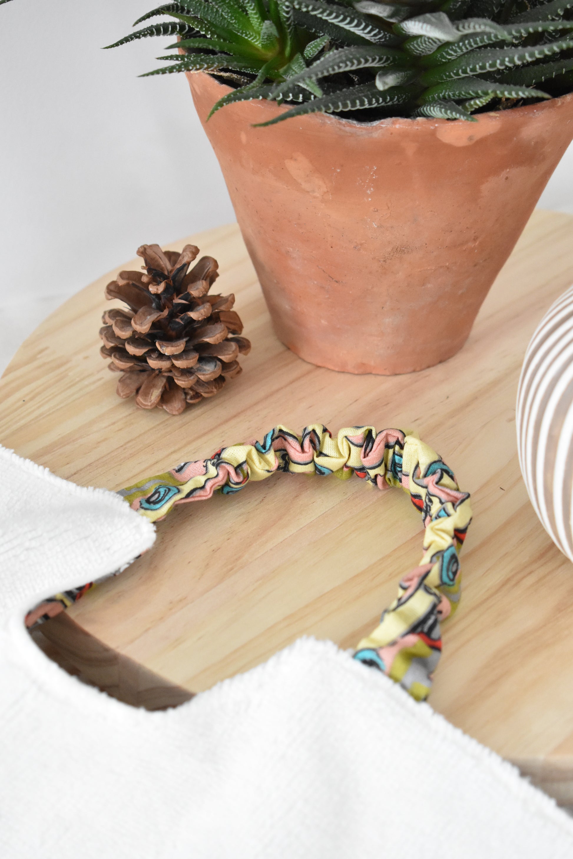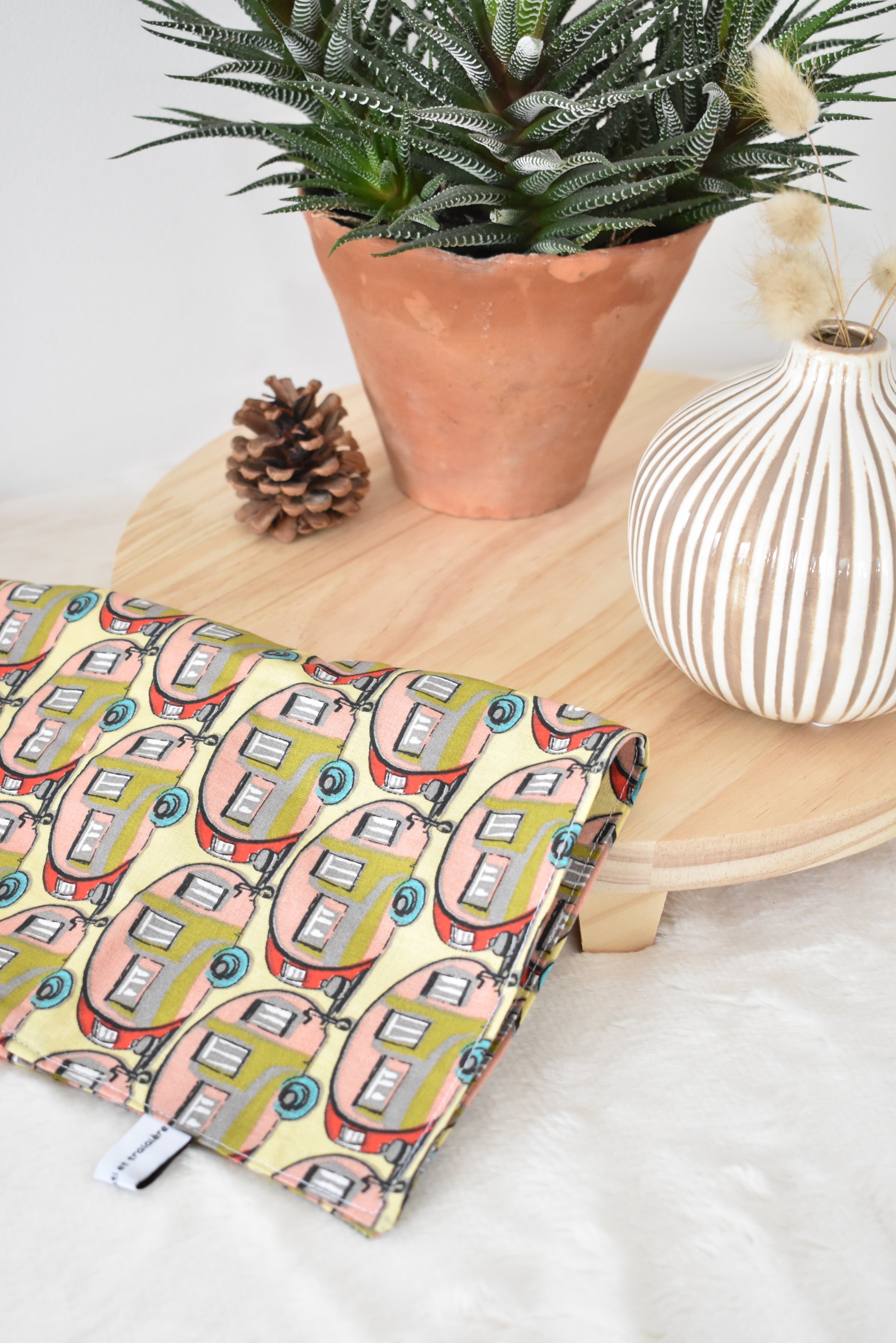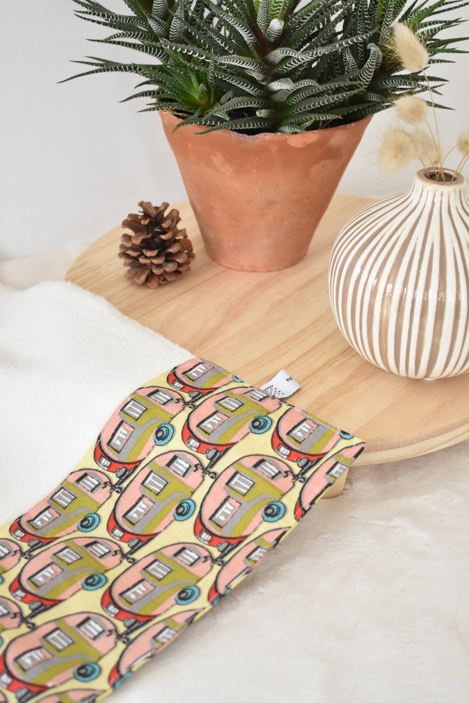 Devant : tissu éponge bambou blanc crème et tissu coton imprimé caravane