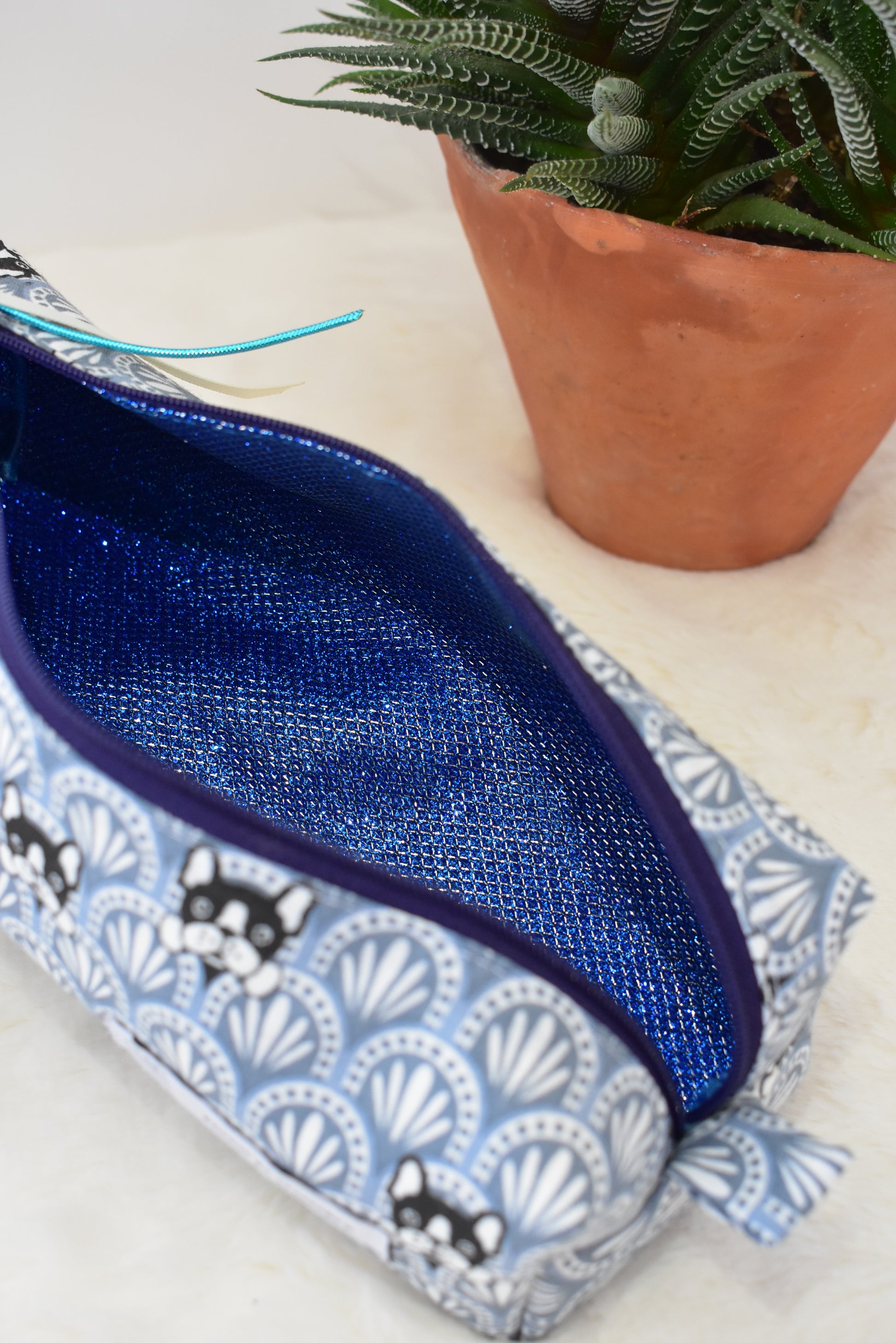 Entretien : Lavage main recommandé avec de l'eau tiède savonneuse. Lavage possible en machine à 30° en cycle normal, avec des couleurs similaires, en laissant la trousse sur l’endroit et fermée (afin de garder les paillettes sur le tissu intérieur pour les trousses pourvues de paillettes).